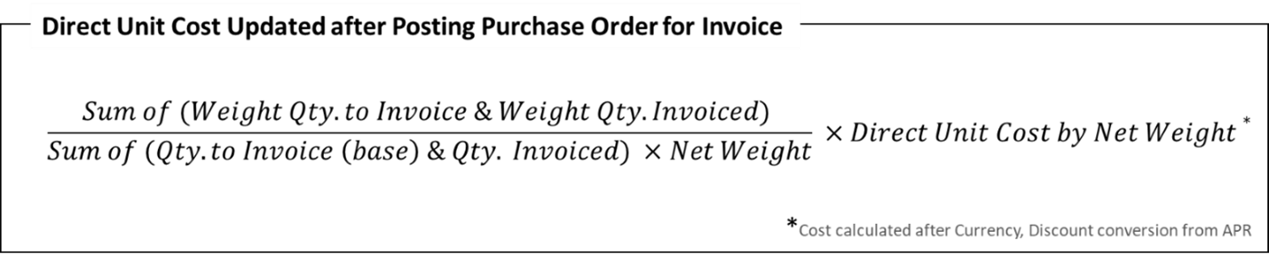 On Partial posting of the Purchase Order for Invoice, the system updates the Direct Unit costs of the Item based on the Quantity to Invoice and Quantity Invoiced.