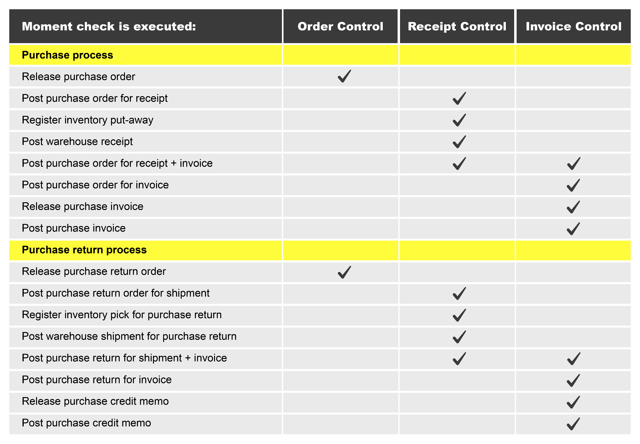 - When releasing a purchase invoice and the purchase compliance document has been set up with the control type "Invoice Control".