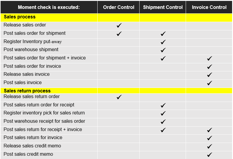 - When posting a sales order for shipment and the sales compliance document has been set up with the control type "Shipment Control."