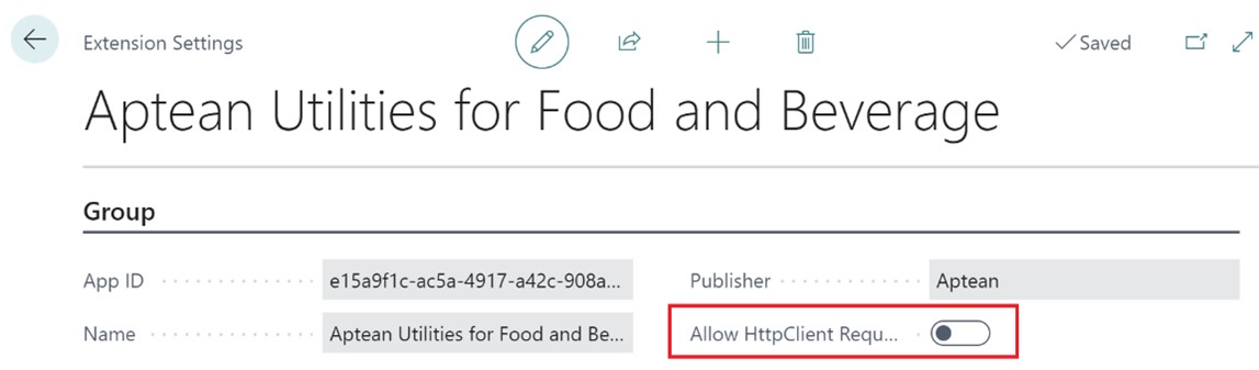 To activate the Http Client Request for any module, on the Extension Settings page, on the Group FastTab, turn on the Allow HttpClient Requests toggle. This activates the runtime and allows the extension to make HTTP requests through the HttpClient data type when running in a non-production environment.