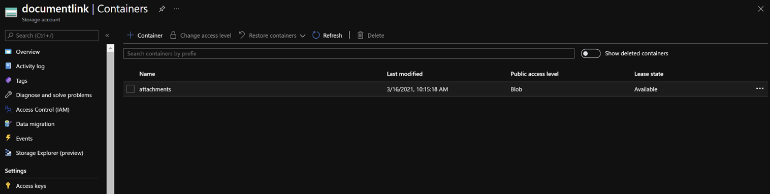 - Create the Storage Account for Document Link and Blob storage container ‘attachments’.