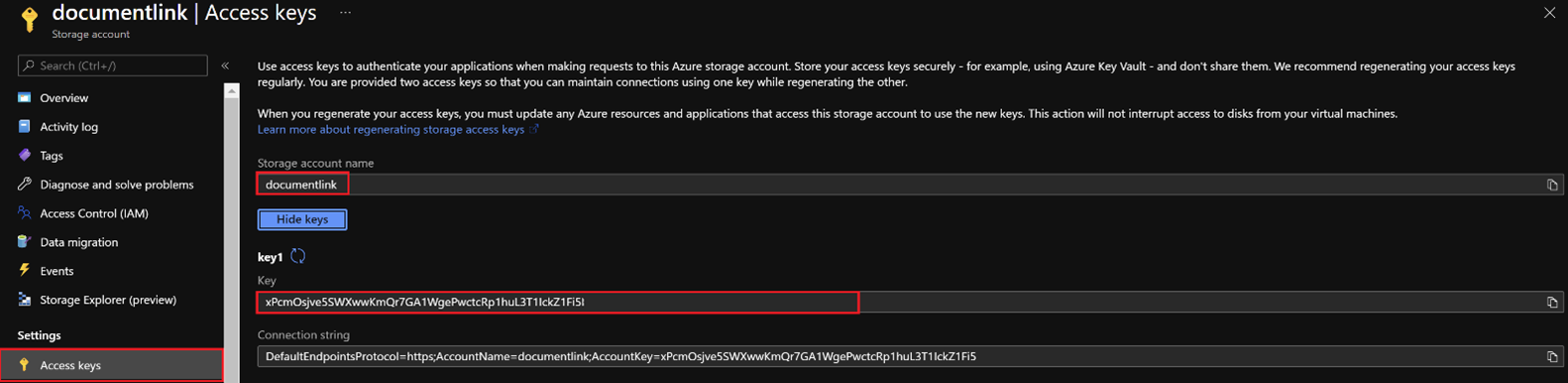 - Select the storage account and select Access keys to retrieve the Storage Account name and Key for accessing the Storage account.