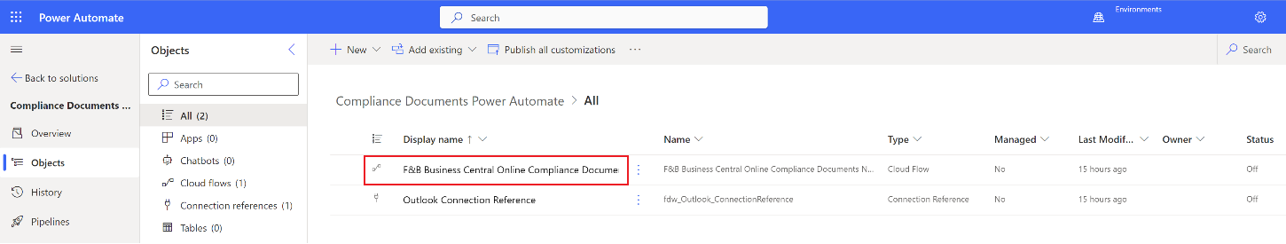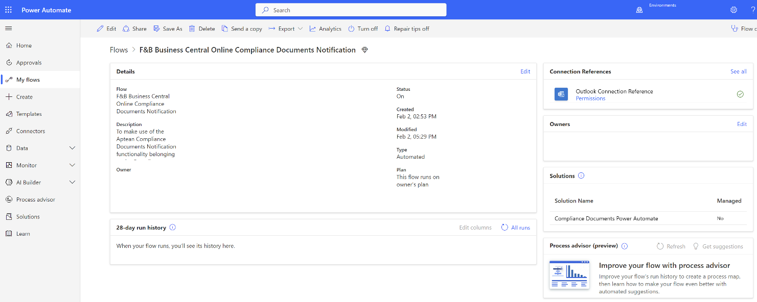 Before using the new version of the Aptean for Food and Beverage Compliance Documents Notifications Power Automate Solution v1.2.0.0, it is necessary to delete the old flow Compliance Documents Notification Flow v1.1.0.0, as described in the Upgrade to the Latest Version section.