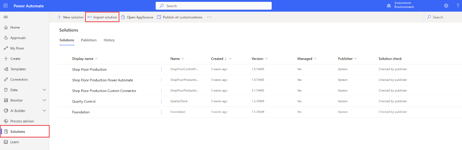 To import the new Aptean for Food and Beverage Compliance Documents Notifications Power Automate Solution v1.2.0.0, follow the below steps:
