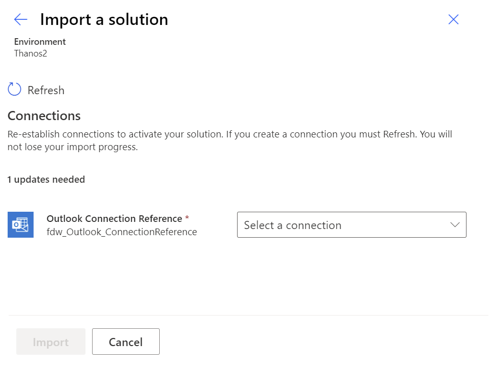If connections do not exist, select New connection to create a record. You should also refresh the Import a solution page to view the created connection.