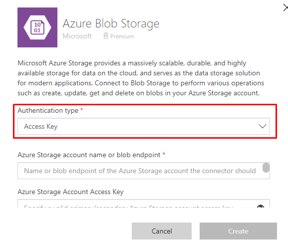 - In the Authentication type field, select Access Key from the drop-down menu while creating a connection with the Azure Blob Storage.