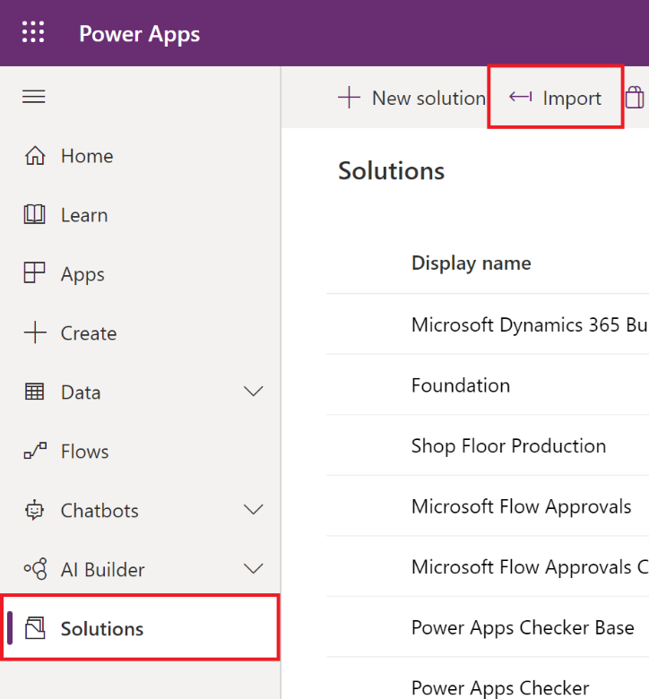 Import the Power Apps Solutions Foundation and Quality Control in the created Power Apps Online environment. Packages (.zip) can be requested by contacting Aptean.