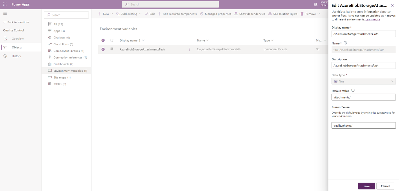 In the Default Solution, search Environment Variables, edit the AzureBlobStorageAttachmentsPath Environment variable and enter your Blob container name to be used as the Current Value. In the example below, the example qualityphotos/ is used instead of attachments/.