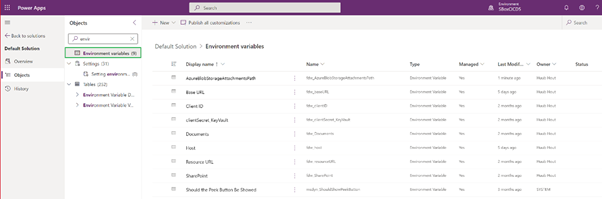 To change an environment variable, go to the Default Solution in your environment, search for Environment variables and select the Environment variable you would like to edit.