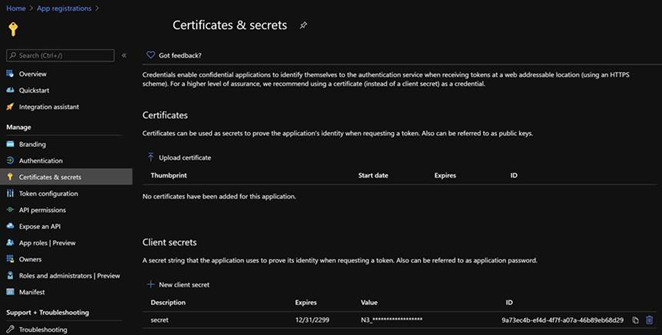 - To create a client secret, on the navigation menu, select Certificates & secrets.