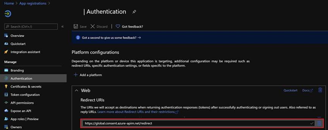 - In the Redirect URLs field, enter https://global.consent.azure-apim.net/redirect. This is a general URL for all custom connectors.