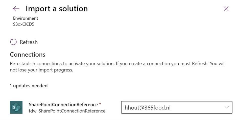 If there are no connection, you can create a new SharePoint connection using the New Connection option. Makesure to Refresh the page to select the newly created connection. Then, the connection will be linked to the Environment Variable SharePoint Connection used in the solution.