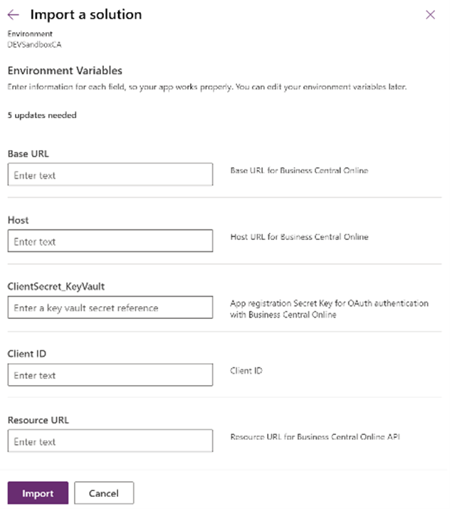 During import, the Environment Variable Values will be asked. Enter the values needed for the Custom Connector to connect and log in users to Business Central Online.