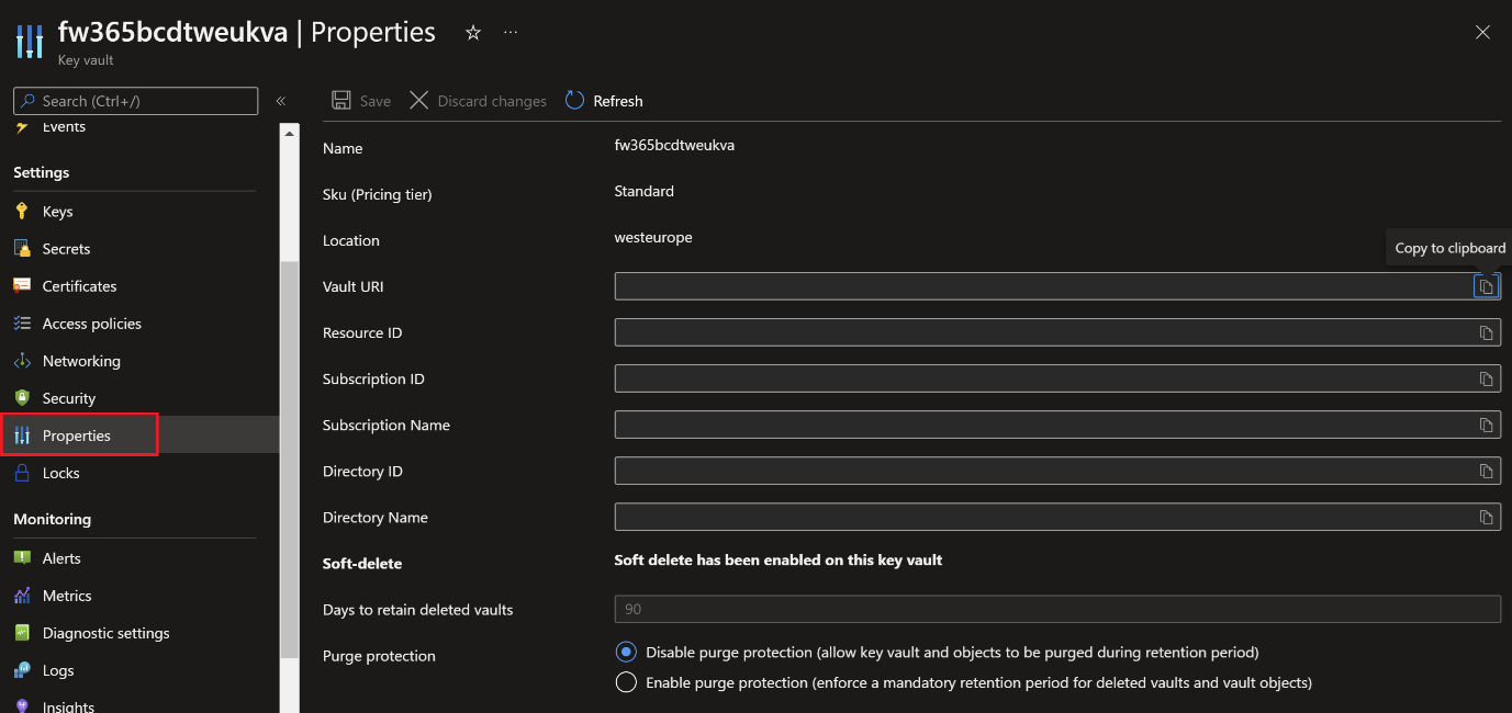 The above information can be found in the Key-Vault Properties; the secret name is the one created as instructed earlier as Key-Vault secret, for example clientSecret.