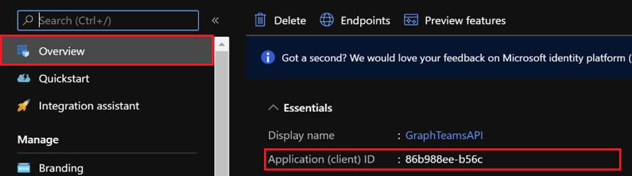 App Registration Client ID can be found on the App Registration Overview tab for the app registration created earlier as instructed.
