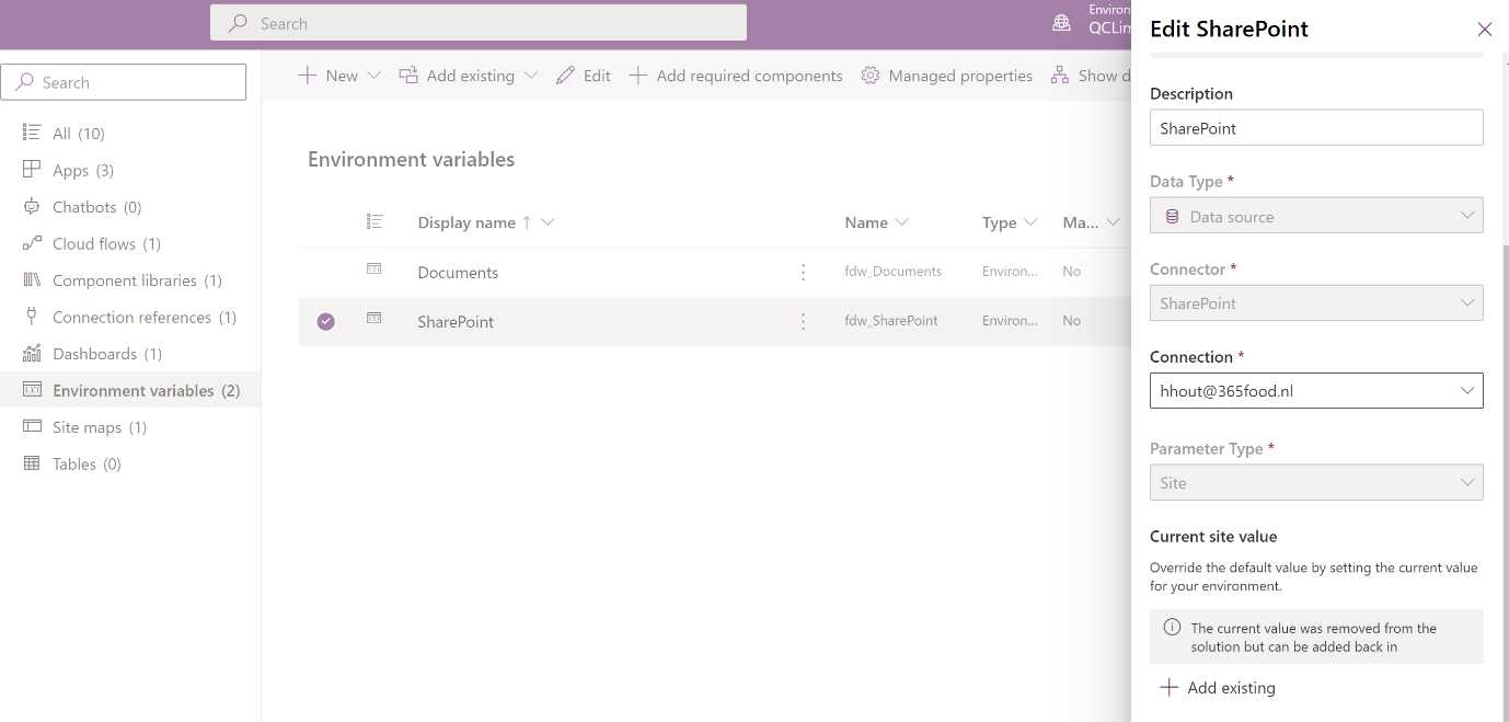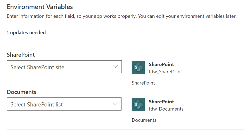 If the Environment Variable is already set up in the environment, its value will not be updated during the import process to prevent overwriting the customer-specific data. You can edit the environment variable manually to change the value after importing. If the SharePoint connection is not established during import or modification later, it can be accomplished by editing the Environment Variable within the Default Solution. Search for the Environment Variables section and Edit the SharePoint value accordingly.