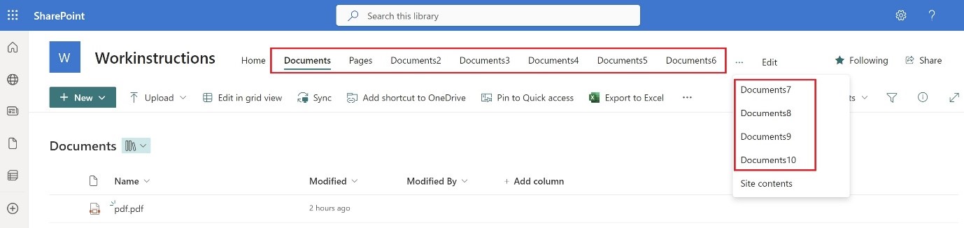 In the SharePoint multiple Document Libraries can be created. In the below image upto ten Document Libraries are created for the site Workinstructions: