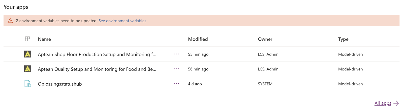 Please ensure that you have installed the corresponding Aptean Shop Floor Production extension on your Business Central environment before proceeding with the update of the latest version of Shop Floor Production Power Apps. To ensure this, check Release Notes for more information.