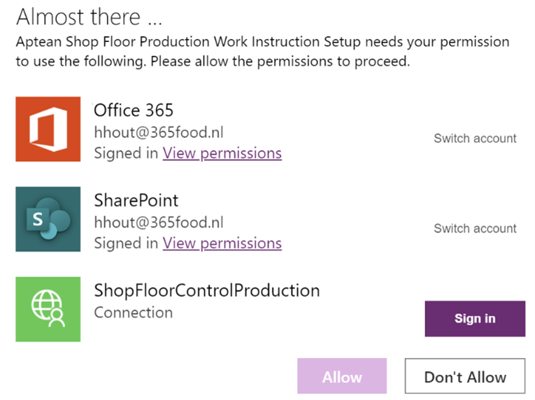Select Sign in for the ShopFloorControlProduction connection.