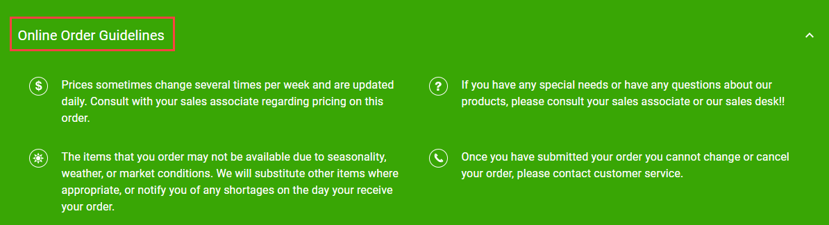 Select the Online Order Guidelines section to expand and view the online ordering instructions.