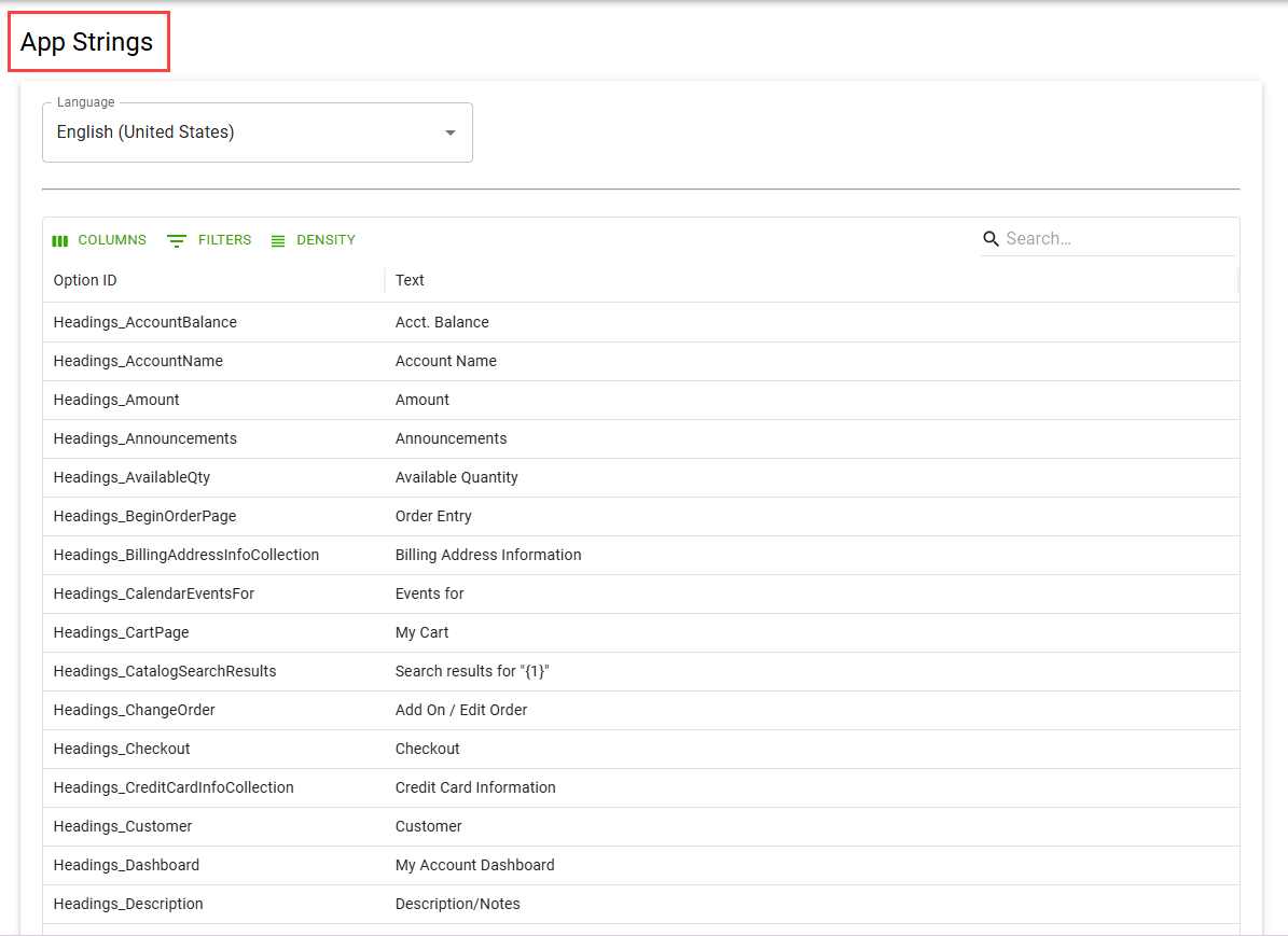 The Option ID field values remain constant across all languages, ensuring consistent reference across translations.Text Specifies the actual label or phrase that end users see in the interface. Use the search bar to filter the required information from the app strings list by entering the details or keywords.