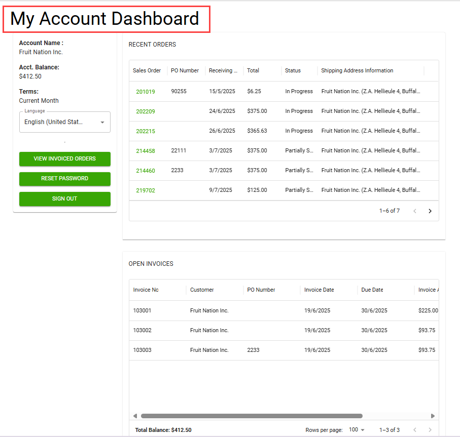 The My Account Dashboard page provides a comprehensive view of your e-commerce activity. You can check your account balance, review recent orders and invoices, manage language preferences, and access account-related actions like resetting your password.