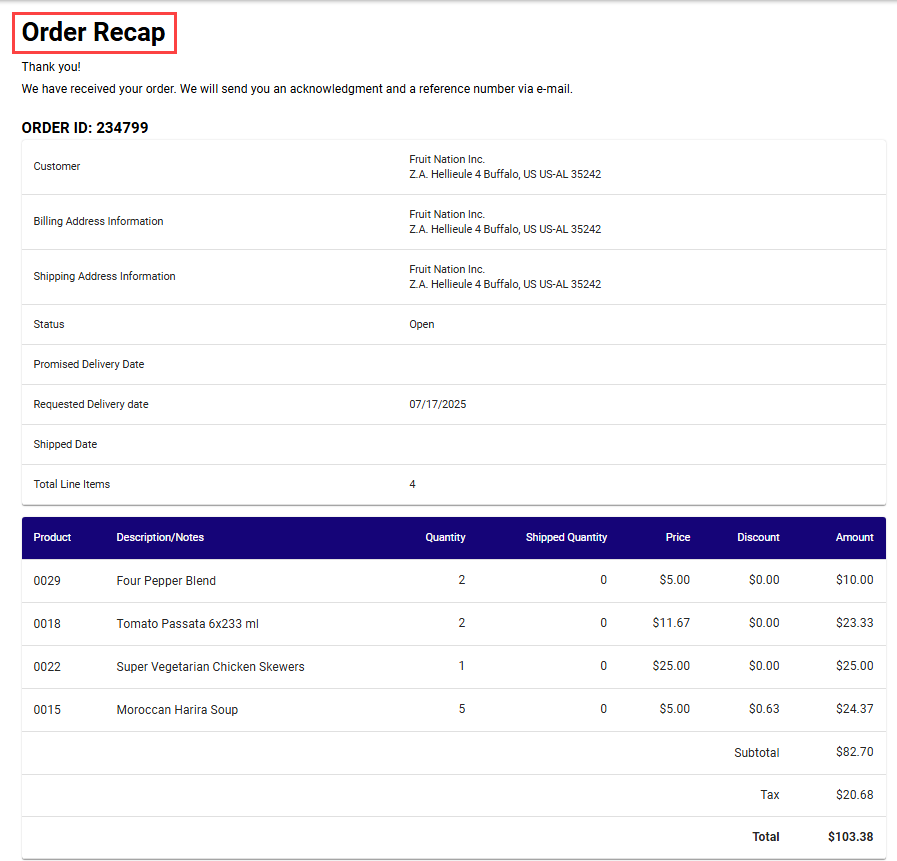 The Order Recap page provides a complete summary of your submitted order. This includes order details, shipping and billing information, and a breakdown of all items ordered.