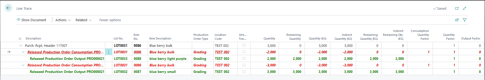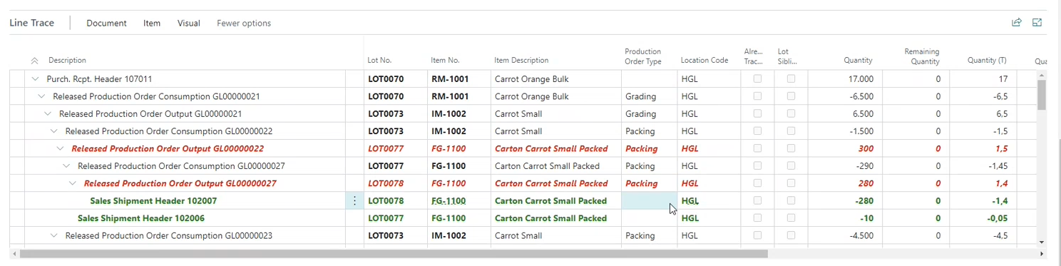 Relevant tracing lines are marked in red or green color. Red lines specify production order lines with the production order type that matches the selected accounting method. For Grade Out, the first consumption of production with the type Grading is marked in red, and for Pack Out all Packing outputs are marked in red. Green lines specify that they are used to calculate the Detail Lines. For Grade Out, the production outputs are shown in green, and the consumption lines are marked in red.
