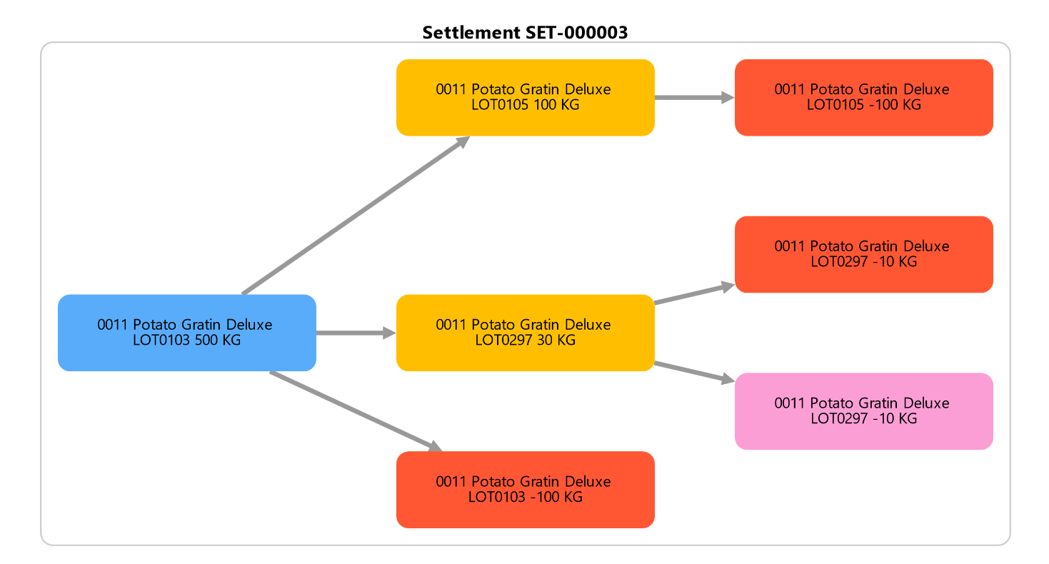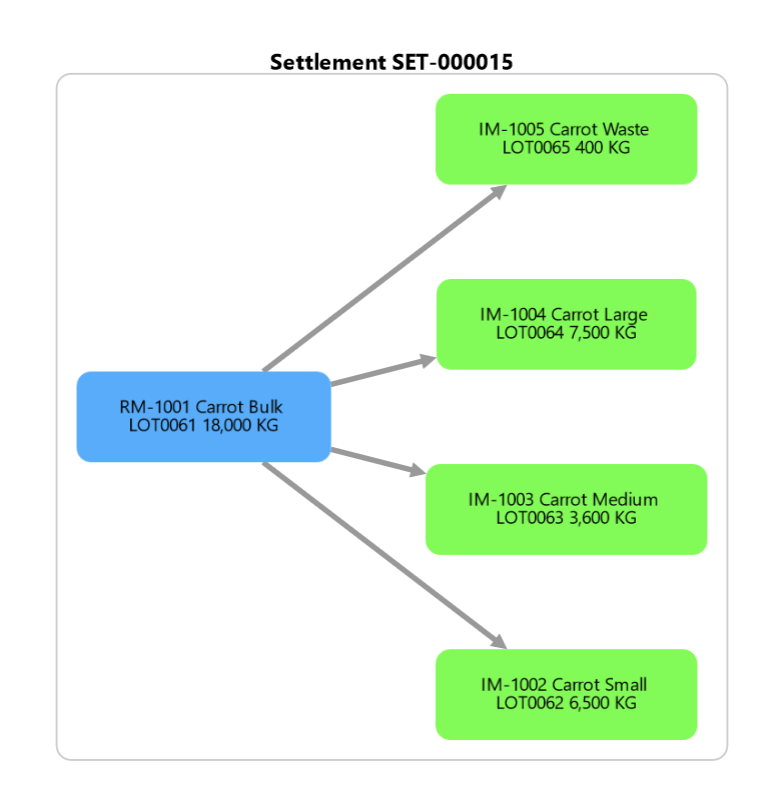 In order to make it easier to see what has happened with a specific lot number and receipt, a visual presentation is provided. This gives you an intuitive overview of the flow of the lots that are purchased and produced. The illustration is based on the Network Diagram set up on the Grower Return Setup page. It allows you to view the settlement trace with multiple lot transactions involved in a specific purchase line receipt.