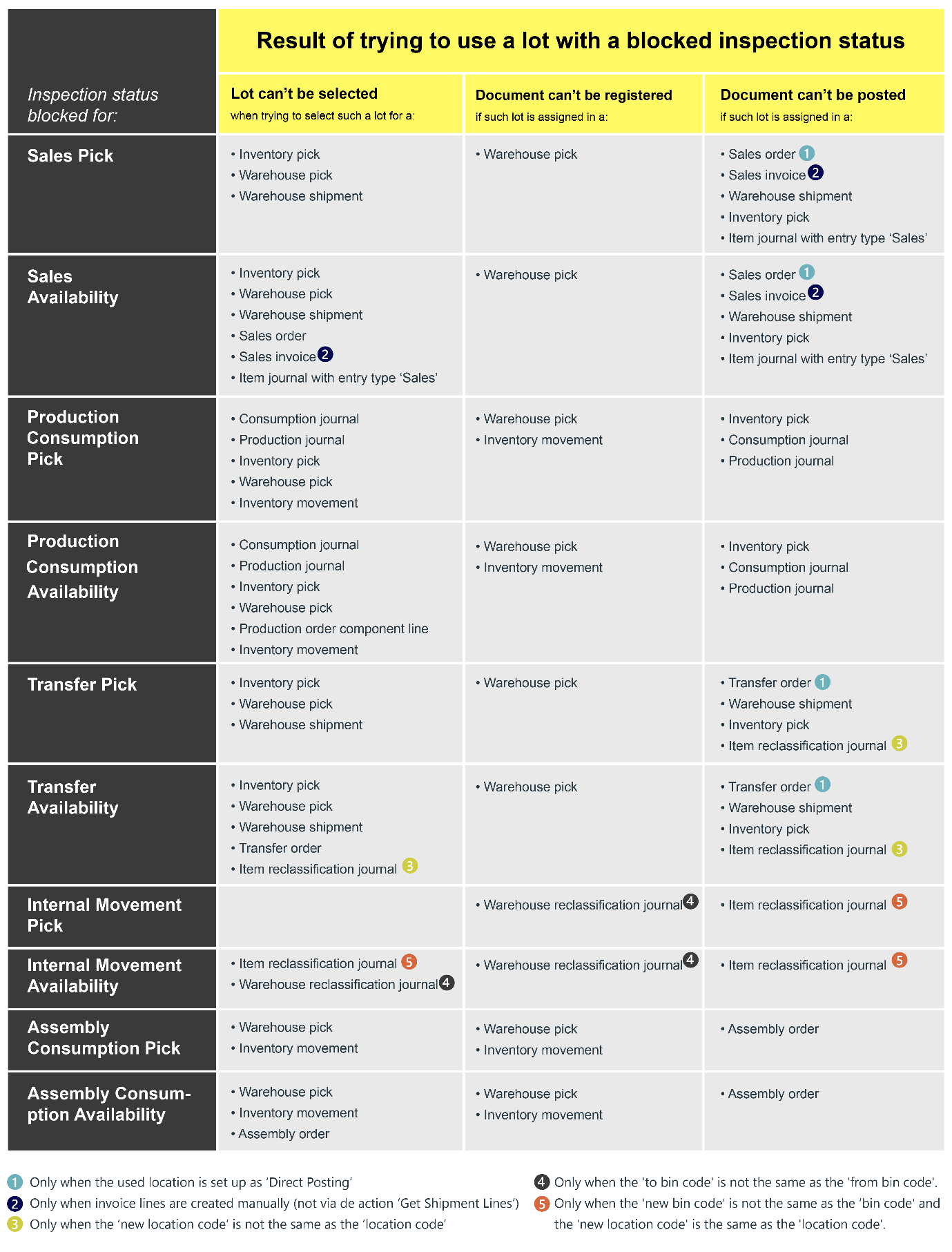 Production Consumption Pick: An error follows if a lot is selected with an inspection status blocked for a production-consumption pick in the consumption journal, a production journal, an inventory pick, or a warehouse pick. The warehouse pick can’t be registered if such a lot is assigned. The inventory pick, consumption journal, and production journal can’t be posted if such a lot is assigned.