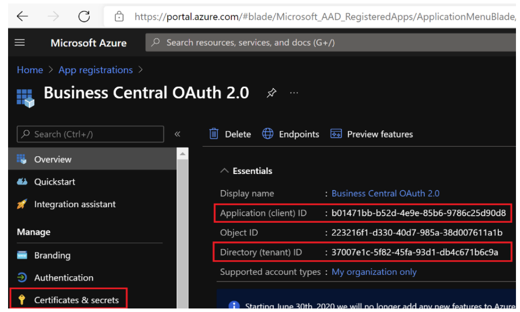 Get registration information to be able to authenticate by using OAuth against your Business Central Online environment or create one as described in the Microsoft documentation.