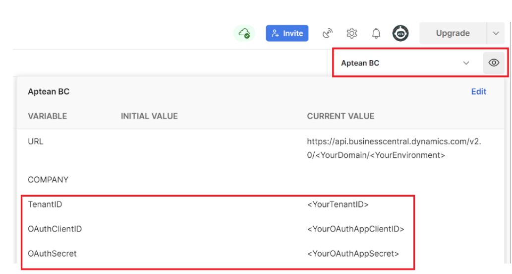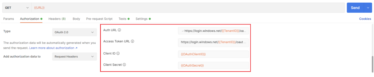 4. To be able to use the OAuth Authorization, set the earlier saved TenantID, ClientID and Secret of the app registration in the Postman Environment variables.
