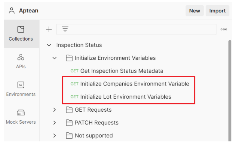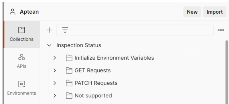 - Import again and import the Aptean Inspection Status.postman_collection.json file. Open Collections to find all provided requests.