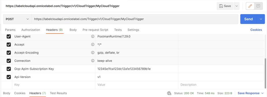 ii. Ocp-Apim-Subscription-Key, key as generated when creating the Cloud Trigger in Nicelabel Cloud, example value: 12345e1fca123dc12a1e123456789b1e.