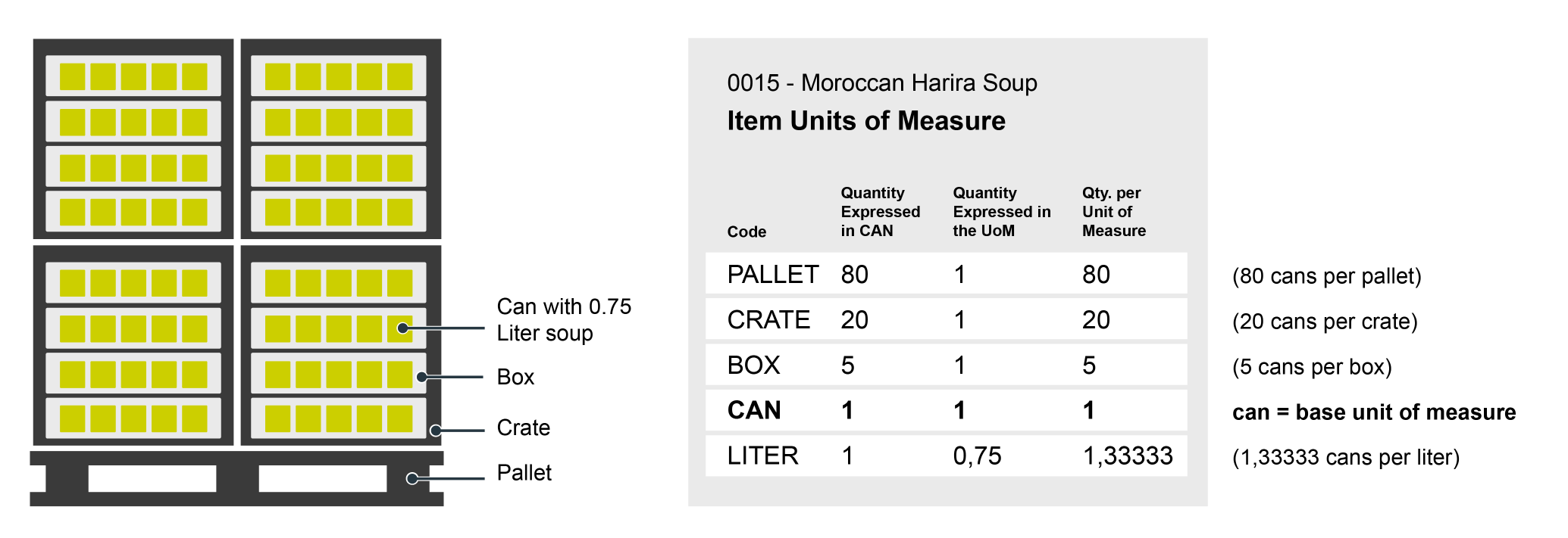 For example, if an item's base unit is a Can and an alternate unit is a Box, Crate, or Pallet, the system ensures that conversions between these units are automatically calculated based on predefined ratios.