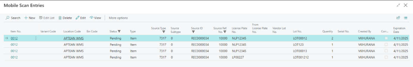 The Mobile Scan Entries page lists down the scan entries that are created in the Aptean Mobile Warehouse application.