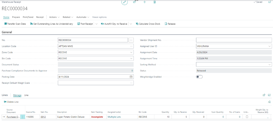 After the transfer of mobile scan entries, the warehouse receipt line has been updated with the Qty. to Receive and Lot Allocations.
