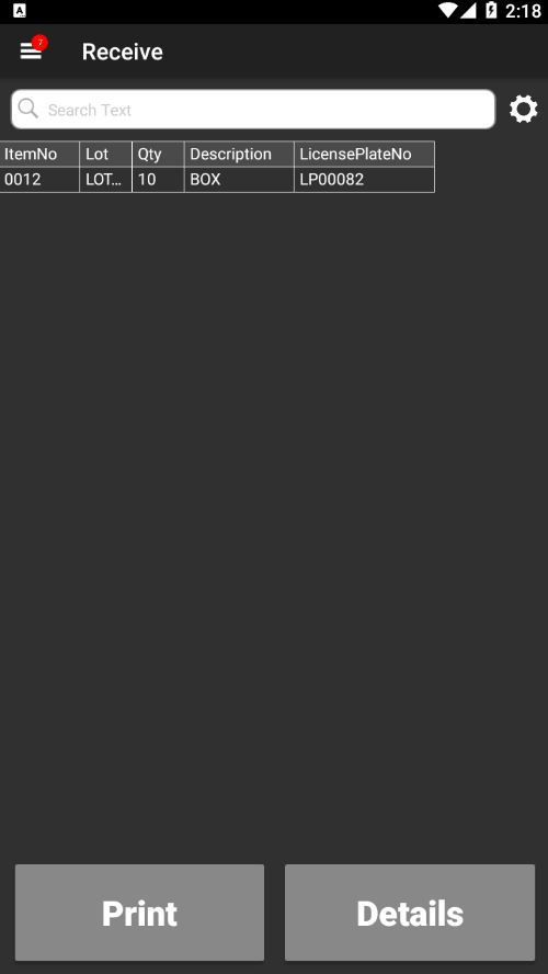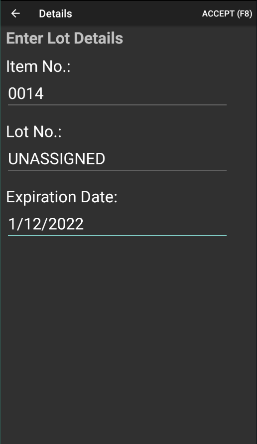 Once any lot details have been recorded, the user can return to the Receive activity by clicking the Accept button at the top of the screen or physically pressing the F8 button on the handheld device. In case Auto Print Tag is enabled in the Mobile Profile Setup page, the lot label will be automatically printed. In case that the Labeling option has been selected in the Label Printing Method field, the printing of the lot label will be handled by the Aptean Food & Beverage Labeling extension. Before being able to print a label, a lot label has to exist which contains 6505 as label subtype. This will match the subtype sent from the API to the mobile device and the label can therefore be used for printing lot information.
