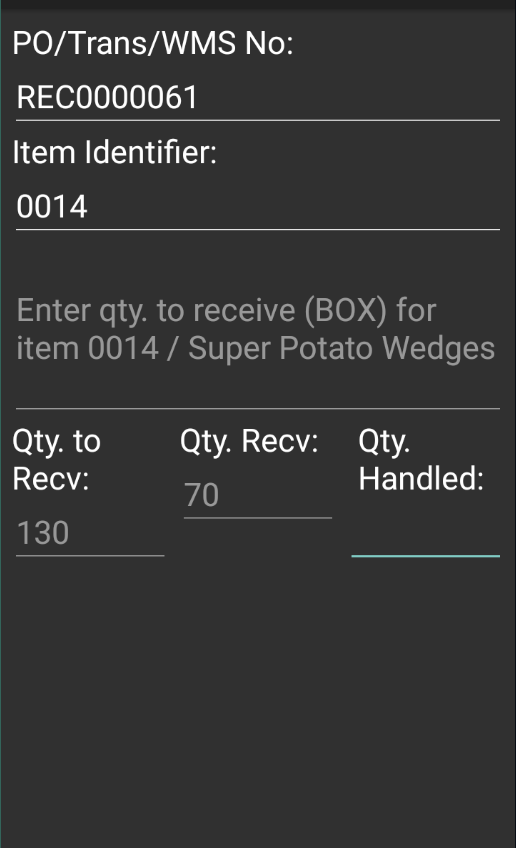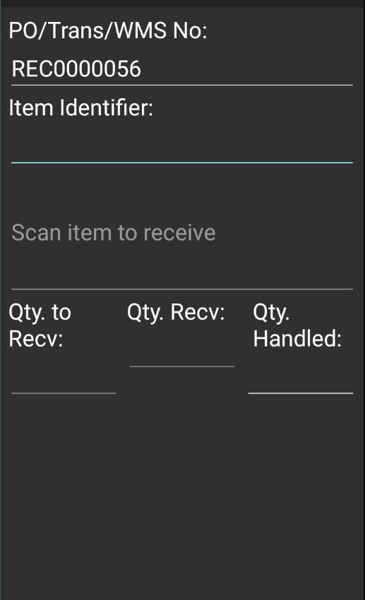 To change the currently-assigned warehouse receipt to a different one, you can manually enter or scan the receipt number in the PO/Trans/WMS No. field and press Enter or F5 on the handheld device.