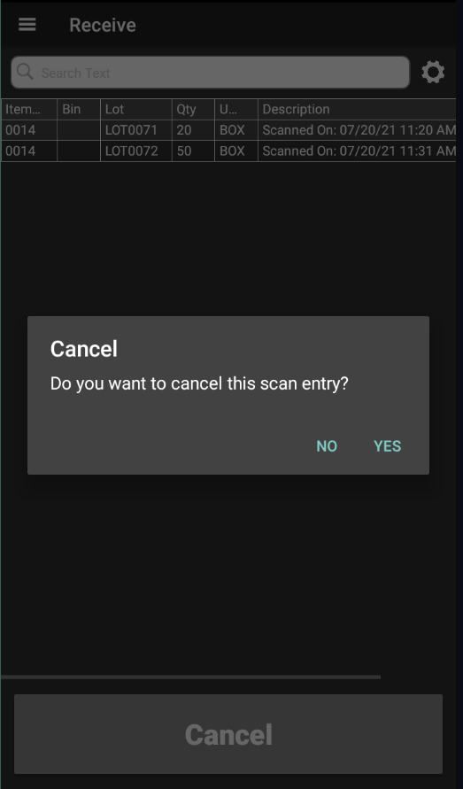 5. To cancel a received quantity, you can select a line on the Scanned tab and click the Cancel button. This will delete the line and undo the receiving activity. After canceling, you can record the receiving activity again.