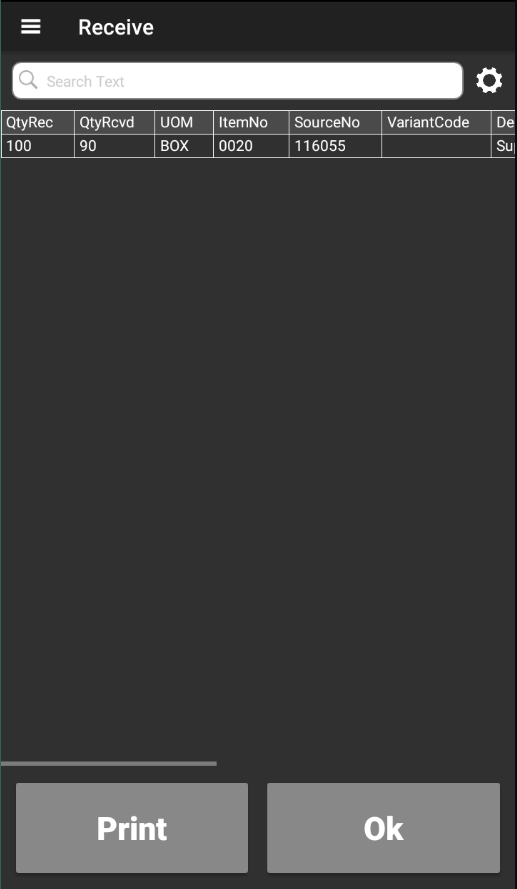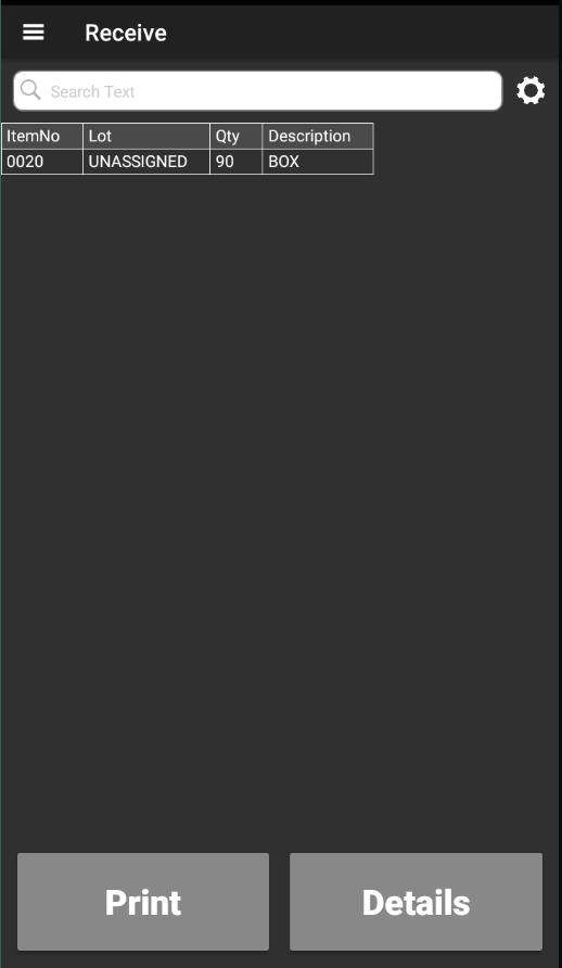 This screen presents a single line for each item (and lot, if applicable) that has been received. This view also includes the quantity of the item that has been received. It is possible to print a label for received items by selecting the desired line and clicking the Print button.