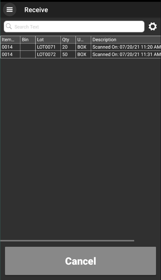 Unlike the Summary tab, this tab presents each receiving activity that was recorded. For example, two receiving activities for the same item and lot would be presented as one consolidated line on the Summary tab, but two separate lines on the Scanned tab.