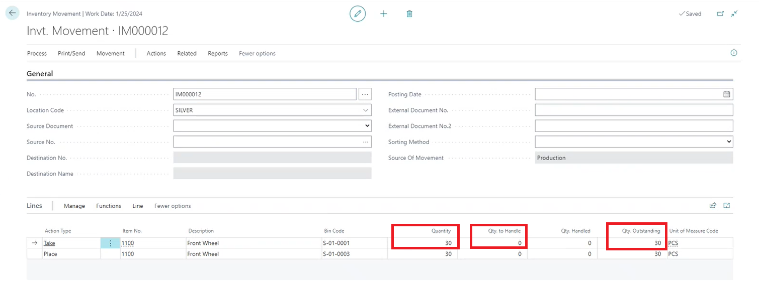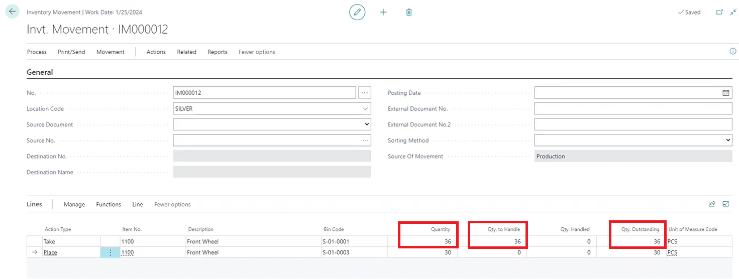 - On the Inventory Movement page, the Source Of Movement field should read Production.