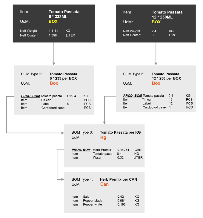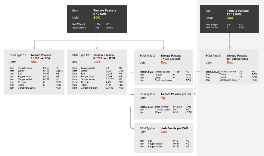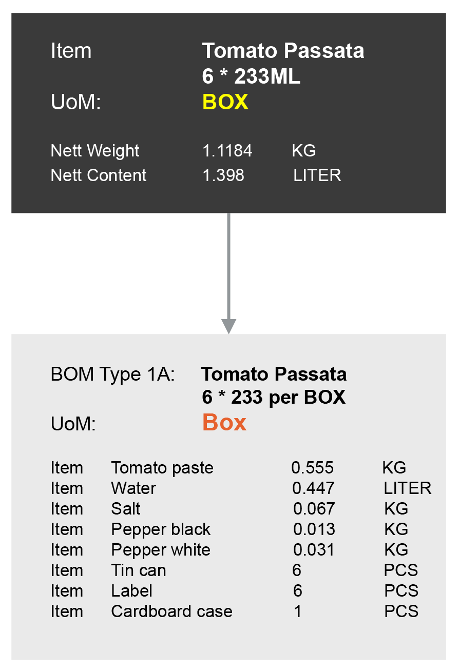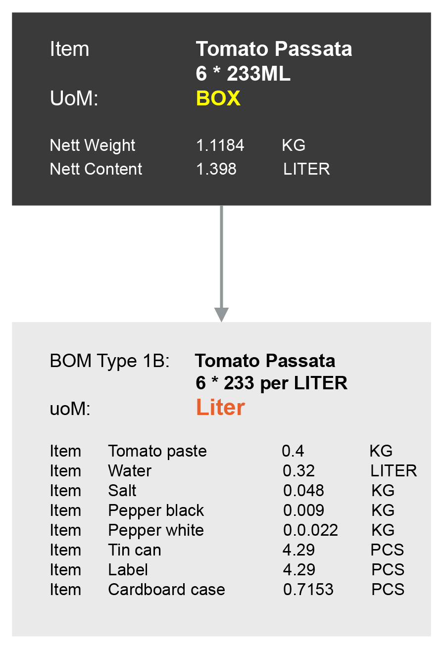 The R&D department of the CRONUS company has defined a recipe for a new item: Tomato Passata. Initially, the item will be sold in a cardboard box containing 6 cans of 233 ML. In a later stage, the same bulk material will also be used in other end products e.g., Tomato Passata 12 cans of 250 ML. The bulk product, however, will always have the same ingredients: