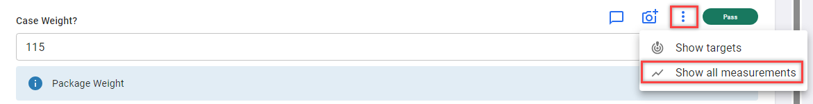 - If the question type is not an integer or decimal (for example, text or option), the Show all Measurements action will be disabled, as the system only supports numeric data for calculations.