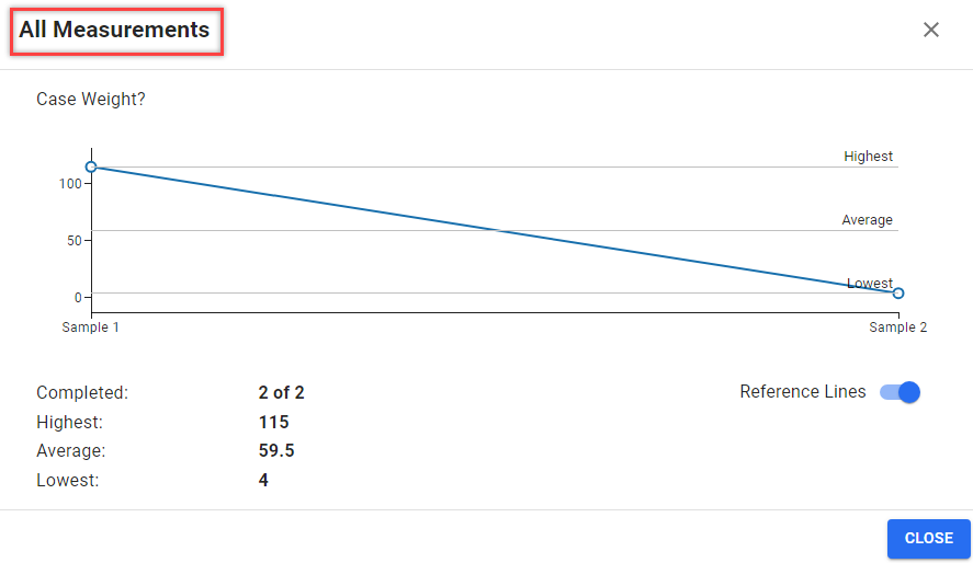 You can view multiple readings for sample-based questions in a quality check. When multiple readings are taken, the system displays the highest, average, and lowest values along with all other readings on a line chart. This is only available for sample-based questions and is helpful for tracking measurement.