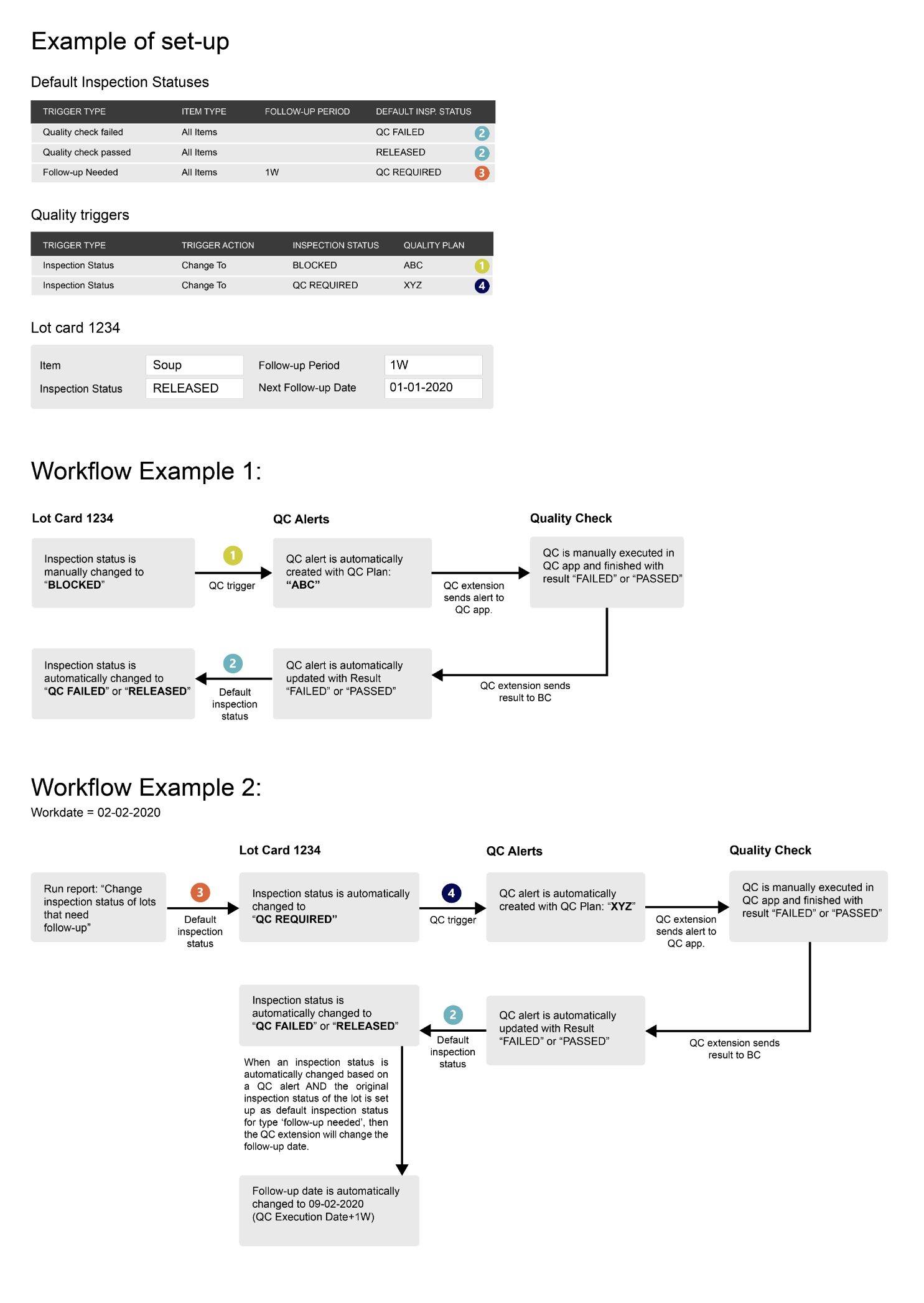 When the quality checks are executed and finished in the ‘Quality Check’ PowerApp, the related quality alerts are updated with the result ‘failed’ or ‘passed’. Via setup in the Inspection Status extension (trigger types ‘Quality Check Failed’ and ‘Quality Check Passed’ in Default Inspection Status) it is possible to change the inspection status of the associated lot number when finishing the quality check.