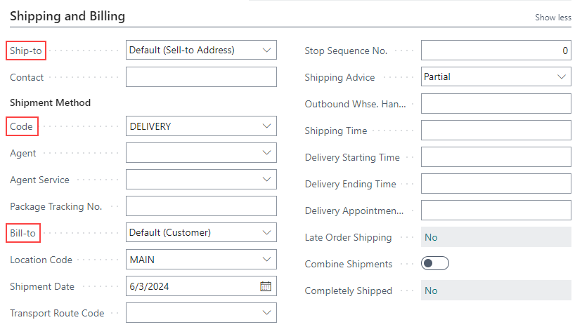 On the Shipping and Billing FastTab, enter/select the following fields: