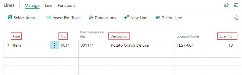- Type – Select the type of transaction that will be posted with the document line. If you select Comment, then you can enter any text in the Description field, such as a message to a customer.