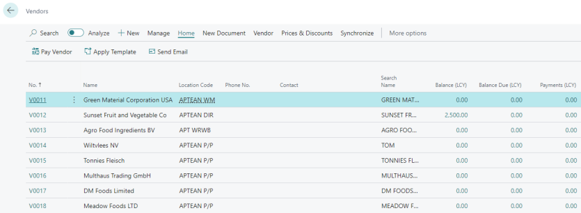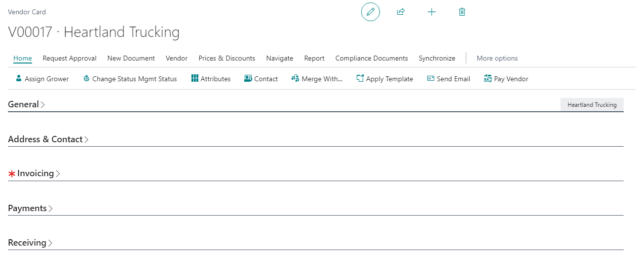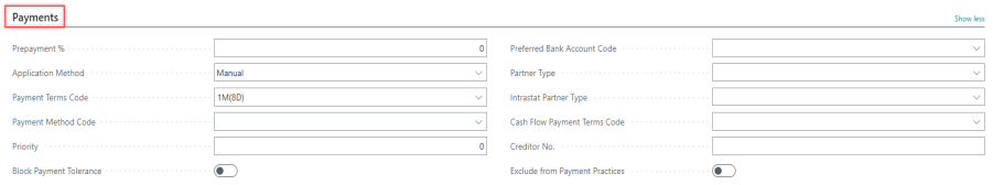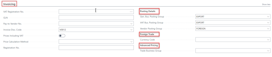 - Vendor No. - Select the vendor number to whom you make payments for products delivered by the vendor listed on the Vendor Card. Ensure to create the pay-to vendor card in the same manner as any other vendor.